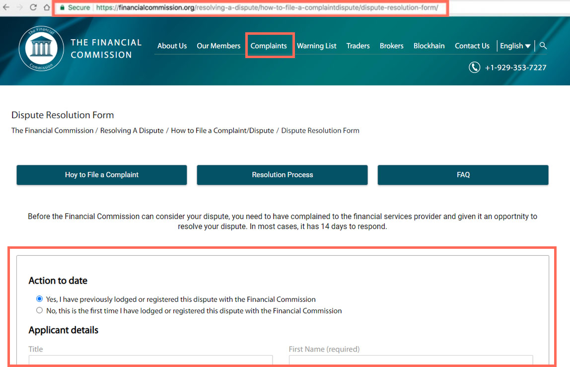 - Customers should always use the Dispute Resolution Form located on our website at the following address to submit an inquiry: https://financialcommission.org/resolving-a-dispute/how-to-file-a-complaintdispute/dispute-resolution-form/ (see screenshots)