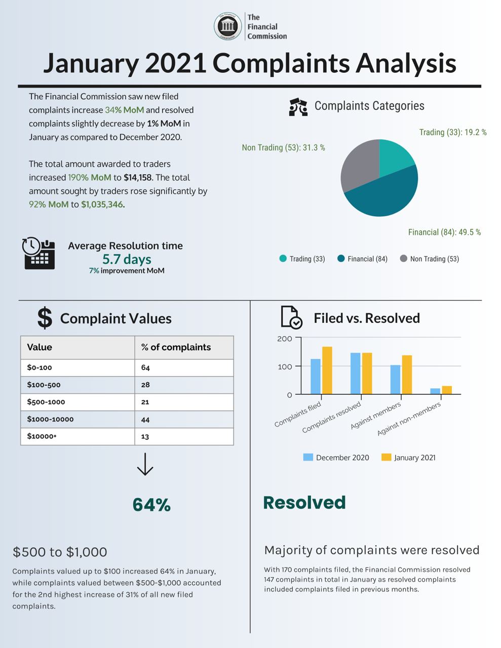 February 15th 2021, The Financial Commission announces continued monthly growth in submitted complaints, as well as compensation sought and awarded to traders for January 2021 as part of its monthly Complaints Digest. The organization recorded a significant increase in compensation sought, percentage of awarded compensation, complaints ruled in favour of traders and several other key metrics while achieving an average dispute resolution time of just 5.7 days.