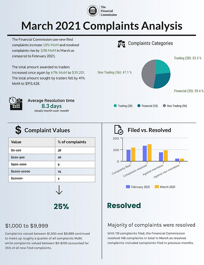 April 7th 2021, The Financial Commission today announces increases in newly filed complaints, resolved complaints, as well as awards to traders and amounts sought from member brokers for March 2021 as part of its monthly Complaints Digest. The organization also experienced a rise in trading related complaints while maintaining a steady average dispute resolution time of just 8.3 days for the month.