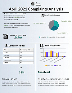 May 13th 2021, The Financial Commission today announces steady month over month figures for newly filed complaints, resolved complaints and other key metrics for April 2021 as part of its monthly Complaints Digest. The organization also experienced a continued rise in trading related complaints while average dispute resolution times fell to just 5.6 days for the month.