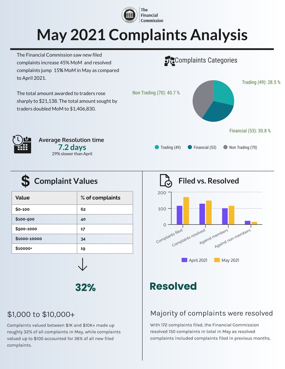 June 9th 2021, The Financial Commission today announces significant increases in key metrics, including new complaints filed, amounts sought and awarded in May 2021 as part of its monthly Complaints Digest. The organization also experienced a further spike in trading related complaints while average dispute resolution times increased to 7.2 days for the month.