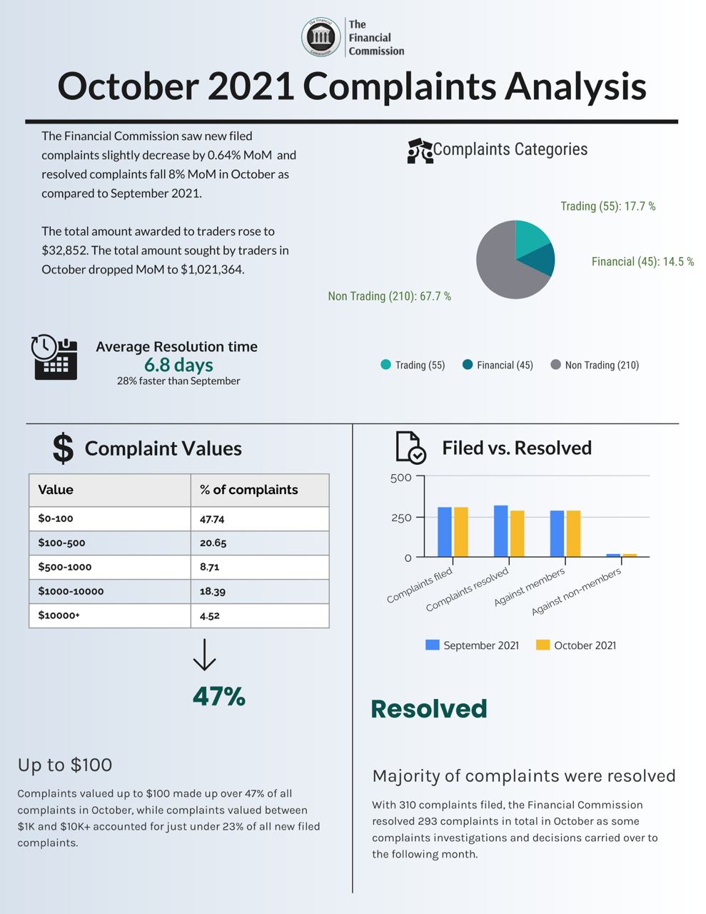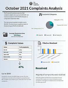 November 8th 2021, The Financial Commission today announces increases in amounts awarded to traders, as well as amounts sought from member brokers in October 2021 as part of its monthly Complaints Digest. The organization also experienced a significant improvement in already swift average dispute resolution times, with a 6.8 days average for the month.