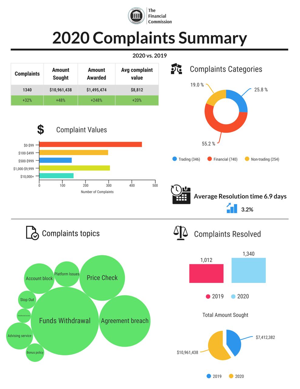 - The Commission experienced another record-setting year in 2020 with traders submitting a record number of complaints and seeking a record amount of compensation while awarding a record amount of compensation to traders and resolving disputes in just 6.97 days on average