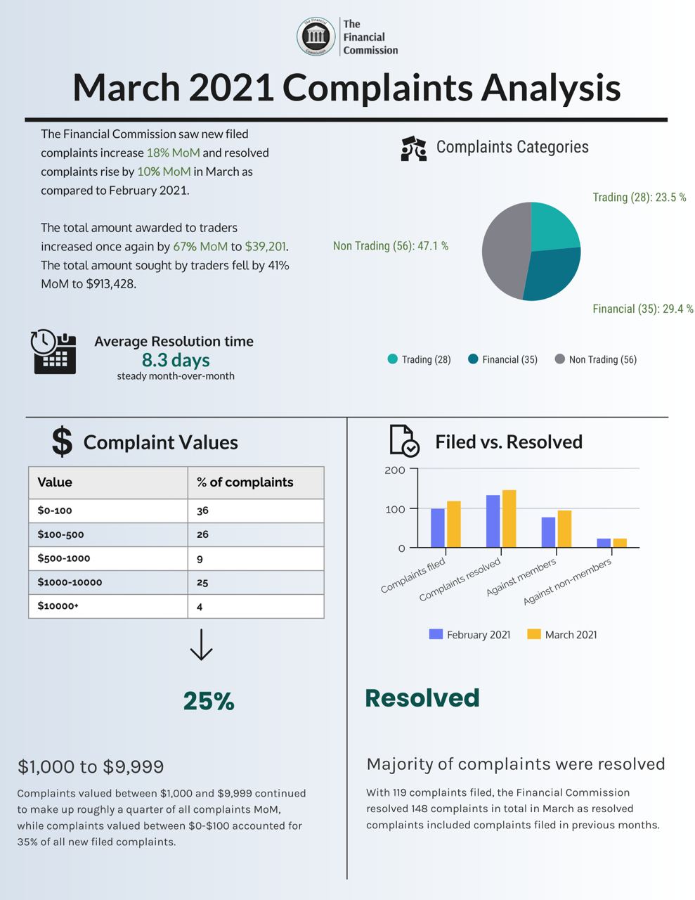 April 7th 2021, The Financial Commission today announces increases in newly filed complaints, resolved complaints, as well as awards to traders and amounts sought from member brokers for March 2021 as part of its monthly Complaints Digest. The organization also experienced a rise in trading related complaints while maintaining a steady average dispute resolution time of just 8.3 days for the month.